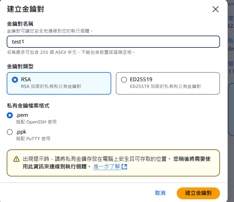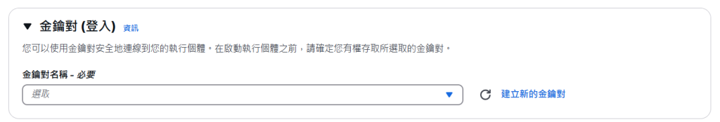 金鑰對,這裡我選擇建立一個,他會下載一個檔案,這個是用於連接 ssh 的私鑰文件