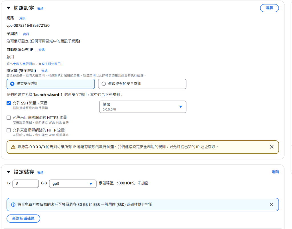 安全群組我保持預設,儲存保持預設的 8G