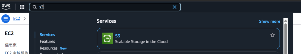 1. 主控台左上方搜索 S3 ,點進去