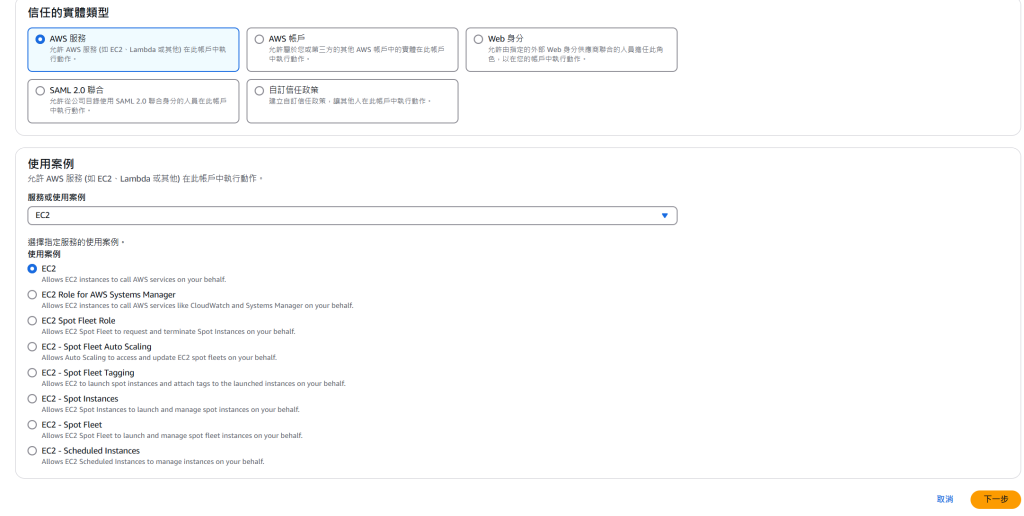 選取 AWS 服務,然後在使用案例下選擇 EC2
