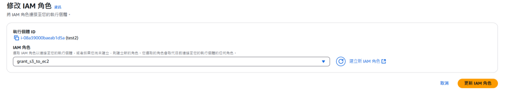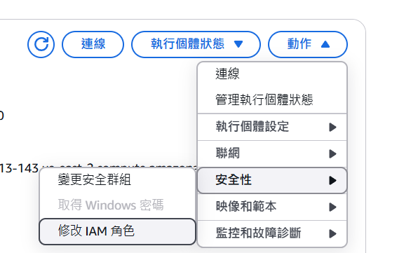 右上 動作標籤 > 安全 > 修改 IAM 角色